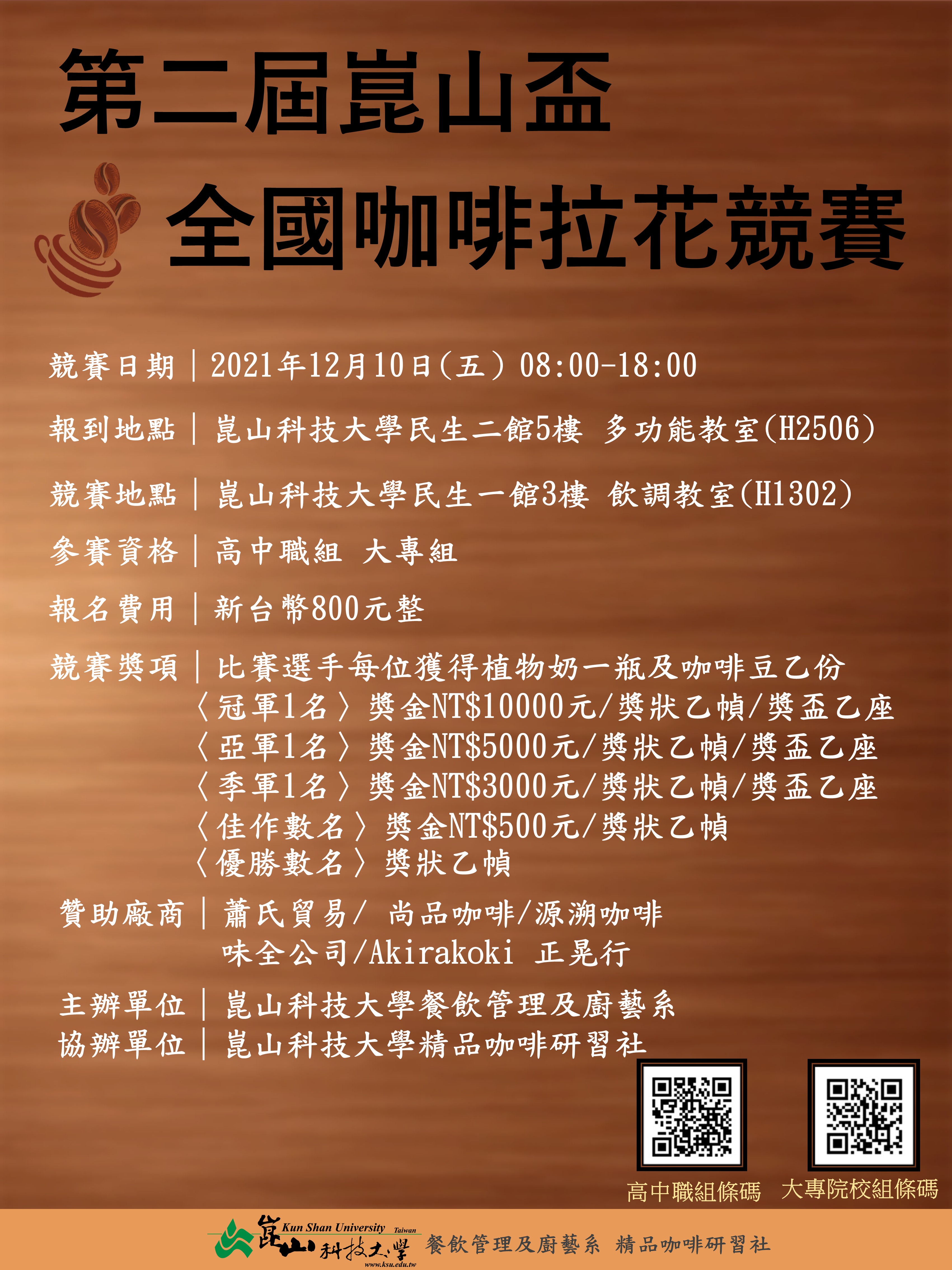 主旨:本校餐飲管理及廚藝系謹訂於110年12月10日(星期五)舉辦「第二屆崑山盃全國咖啡拉花競賽」,邀請大專校院及高中職學生踴躍報名參加,請查照。